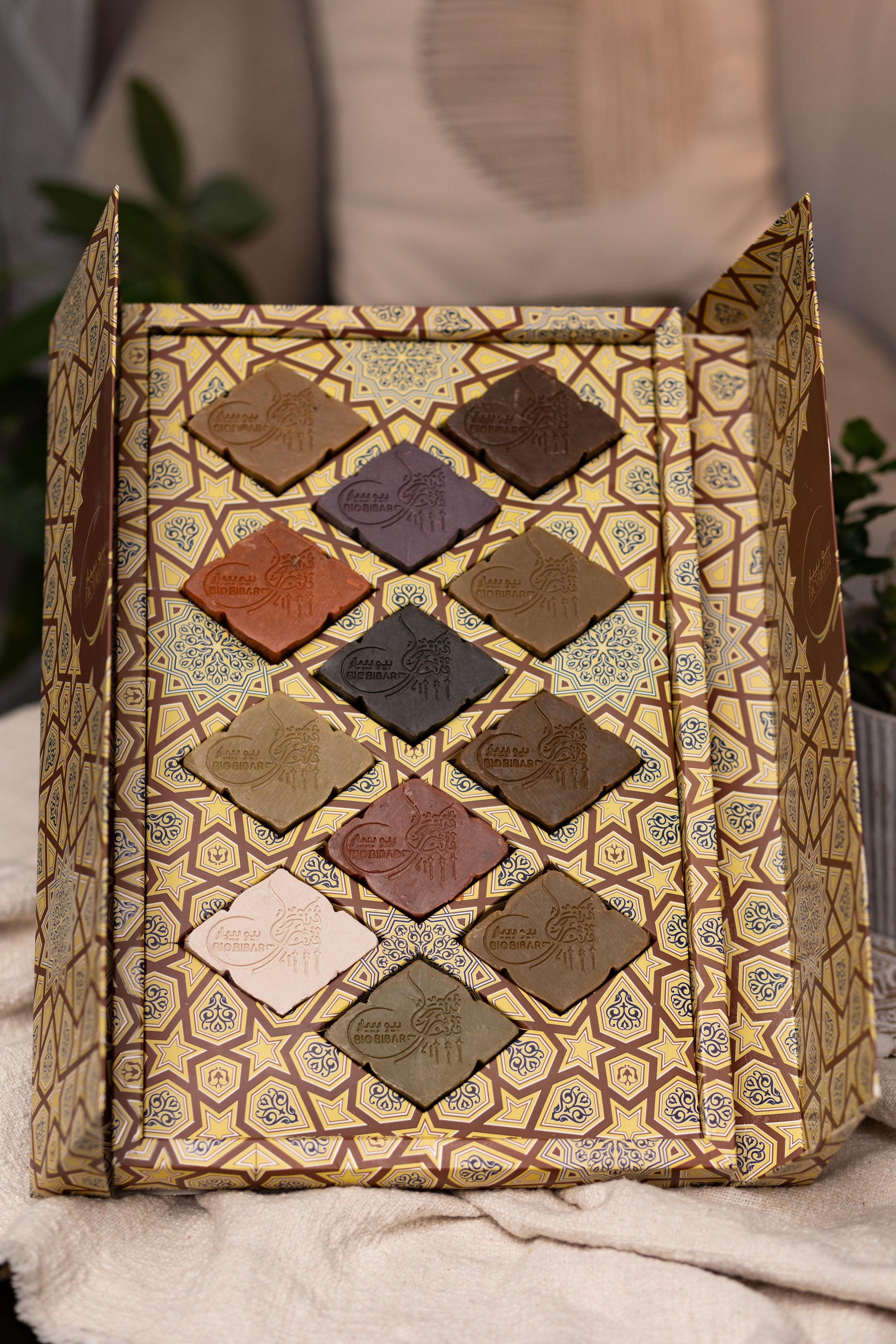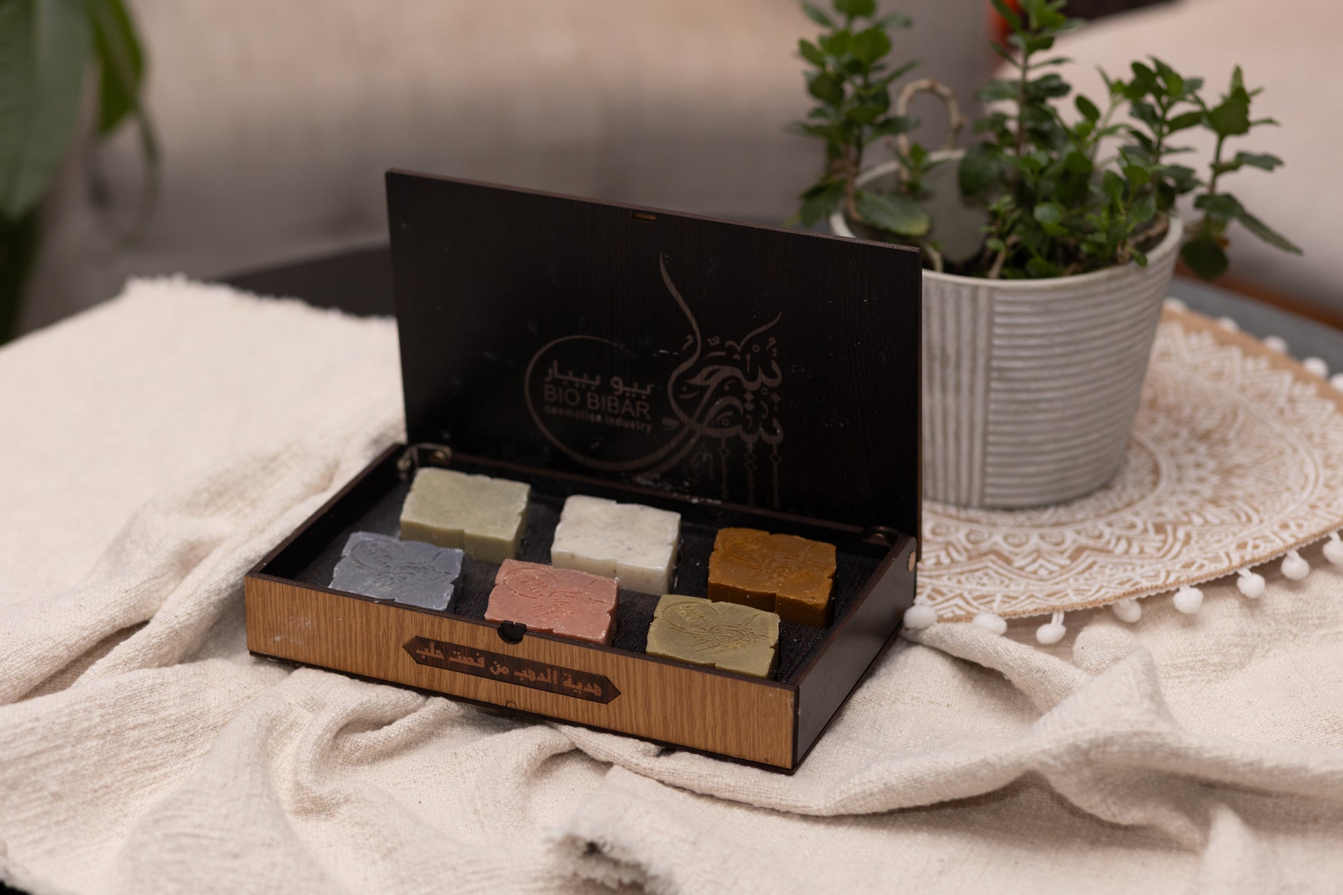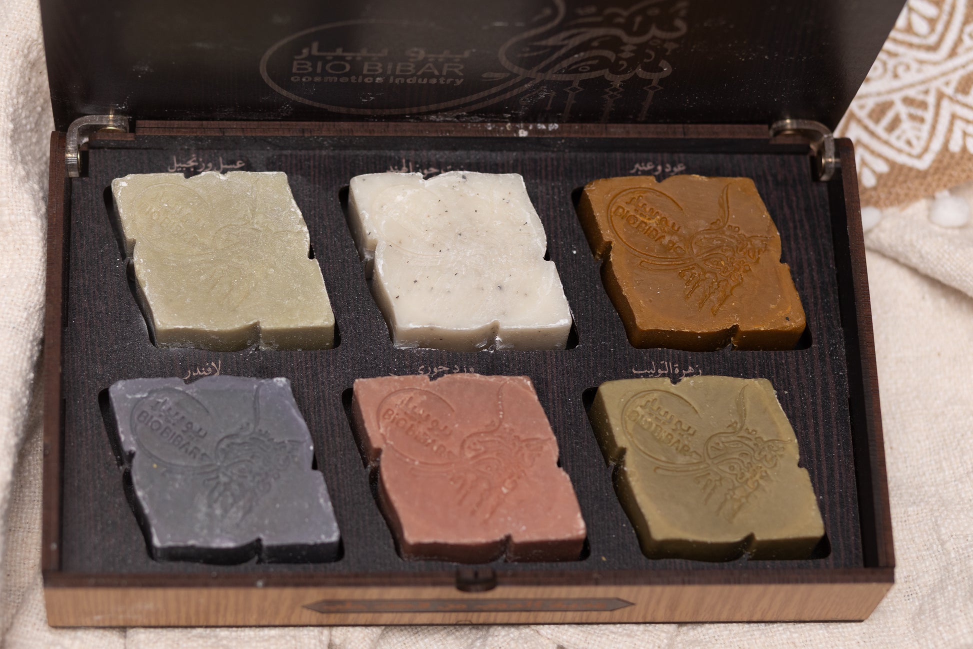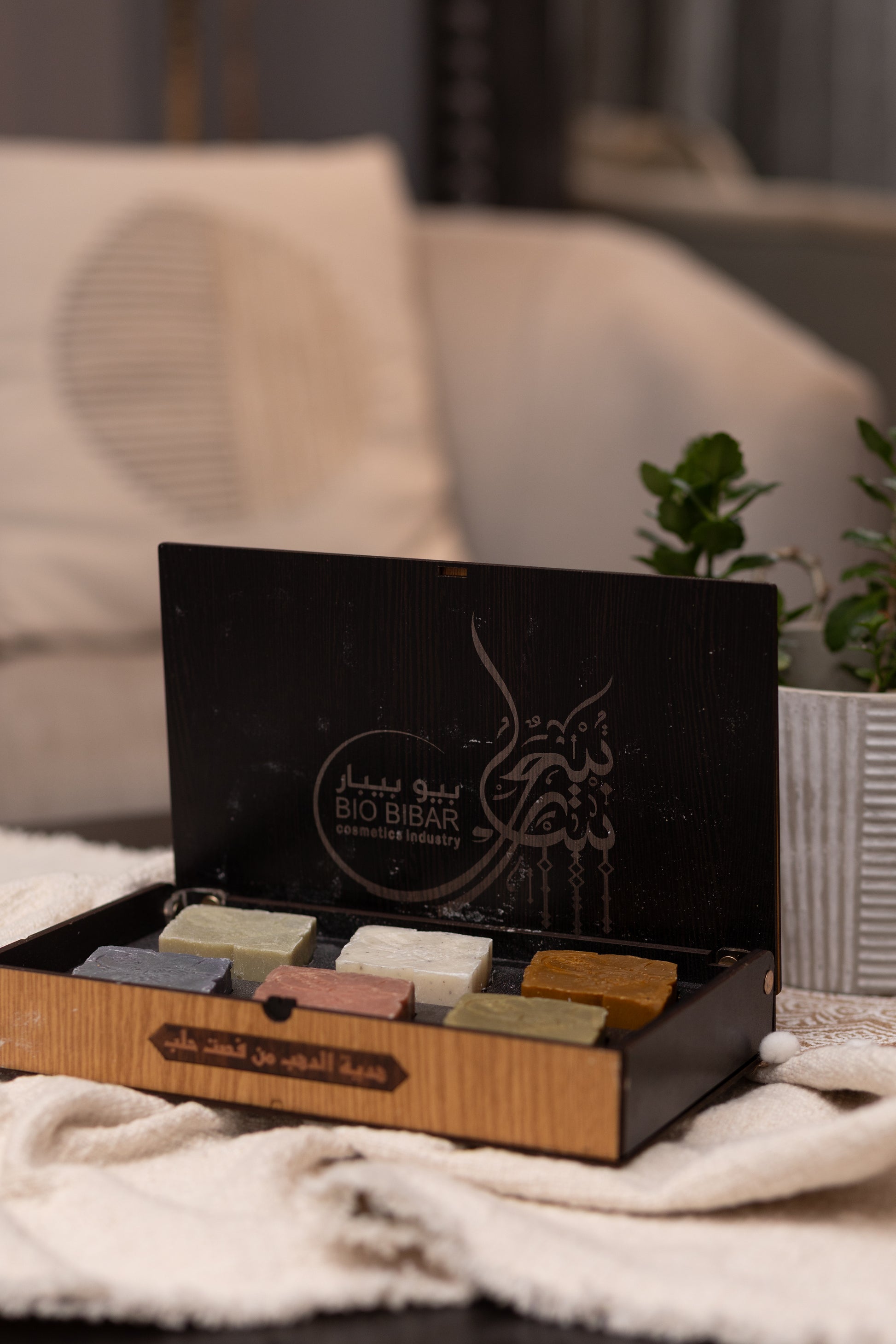 Set of premium soaps, each with a unique and dazzling aroma. The perfect gift for any occasion. Available in a standard cardboard box (3 piece, 6 piece and 12 piece) and a deluxe engraved wooden gift box (6 piece).