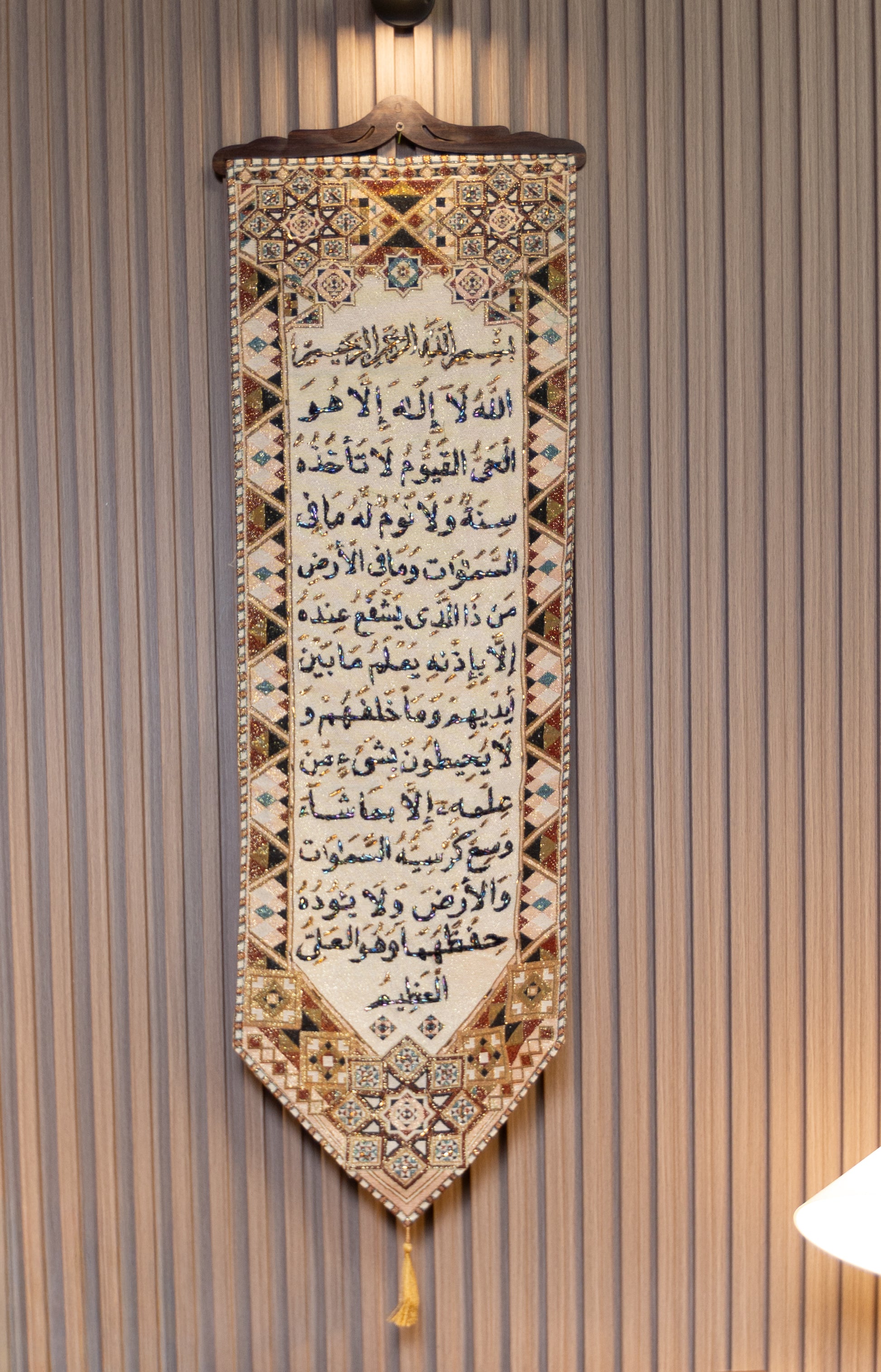 Breathtaking, detailed beaded artwork featuring Quranic verses and prayers. Made in Syria. Dimensions: 97 cm X 31 cm.