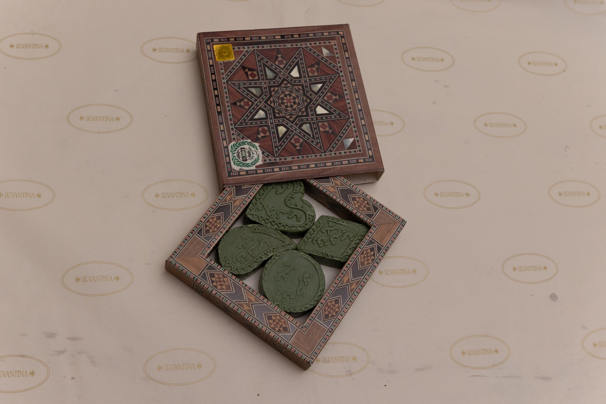 Set of four mini olive and laurel oil soaps in a cardboard box.